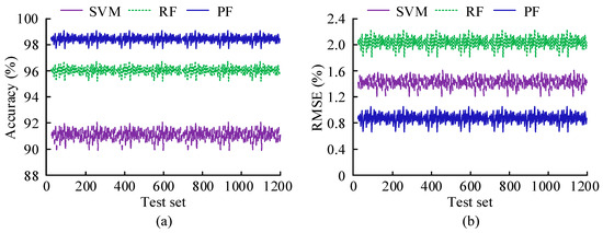 This study continued to compare the accuracy of capacity prediction using Support Vector Machine (SVM), a Random Forest (RF) network model, and the PF algorithm. The choice of SVM and RF for comparison is due to their excellent performance in handling nonlinear problems and high-dimensional data, as well as their widespread application in the field of battery state estimation. To ensure fair comparison with the PF algorithm, RF and SVM adopted a unified and standardized configuration. All methods used the same input feature set, including battery voltage, current, temperature, and historical SOC data. The proportion of training sets for all algorithms was 80%. The kernel function of SVM was RBF, the penalty parameter was 10, and the kernel function parameter was 0.1. RF consisted of 100 decision trees, with a maximum tree depth of 15 and a minimum sample size of 5 for leaf nodes. The evaluation indicators we used included accuracy and RMSE as prediction accuracy evaluation indicators. The test dataset was the LiNiMnCoO2 dataset. The capacity prediction results of each method on different datasets are denoted in Figure 10. In Figure 10a, the capacity prediction accuracy of the PF algorithm was as high as 98.34%, which was 7.24% and 2.38% higher than SVM and RF algorithms, respectively. According to Figure 10b, the RMSE of the PF algorithm was only 0.82%, while the RMSE of the RF algorithm was as high as 2.05%, and the RMSE of the SVM algorithm reached 1.43%. The PF algorithm had significant advantages in predicting battery capacity accuracy. The core advantages of the PF algorithm come from the probability inference mechanism of PF, strong noise resistance, ability to handle complex decay mechanisms, and flexible real-time updates. These advantages enable the PF algorithm to have better predictive performance in battery management systems that require high precision and dynamic adjustment.