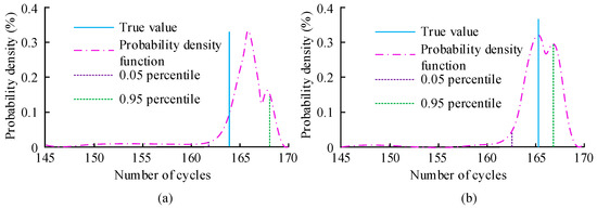 This study finally validated the RLP results of the PF algorithm for two batteries, as shown in Figure 11. Due to the differences in parameter vectors of the PF algorithm and the influence of noise, there was a certain error between the true value of the RF and the maximum a posteriori probability estimated by the PF algorithm. In Figure 11a, the average prediction error of the PF algorithm for LiNiMnCoO2 batteries was only 1.253 cycles. This indicates that the PF algorithm can accurately estimate the remaining service life of batteries with relatively small errors, and it can effectively support the long-term planning and use of battery management systems. In Figure 11b, the average prediction error of the PF algorithm for LiFePO4 batteries was only 0.053 cycles, indicating that the RLP accuracy based on the PF algorithm was relatively high. In addition, based on particle frequency distribution, this study calculated the 90% prediction interval for the remaining service life, which ranges from the 0.05 quantile to the 0.95 quantile. From Figure 11, the true values of the RL of each battery were within the prediction interval of the PF algorithm, which once again confirmed the high accuracy of this method in RLP of batteries.