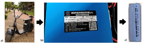 Study object (a) Citycoco Harley e-scooter; (b) 60 V–12 Ah battery module; (c) Li-ion cell LXD18650 20P3.