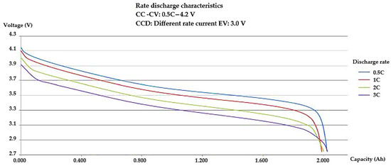 In the performance test, the manufacturer tested the cell under various discharge rates (1000 mA to 6000 mA) and a cut-off voltage of 2.75 V. Charging at 1000 mA–4.2 V CC-CV is described below. Figure 3 shows the cell’s voltage versus discharge capacity.