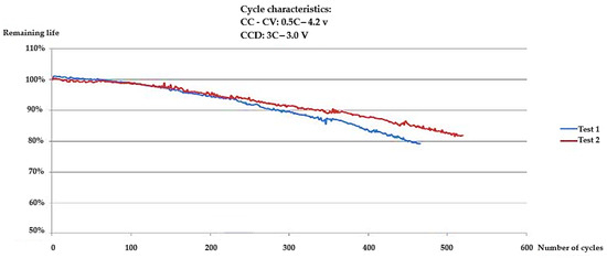To test the cell’s lifetime, the manufacturer performed cycling tests. Using the charging rate mentioned (1000 mA), and a discharging constant current rate of 6000 mA (3C) to a cut-off voltage of 2.75 V, waiting 10 min between charging and discharging, under the standard temperature and humidity conditions mentioned below. After three consecutive cycles, if the cell is ≤80% of its initial capacity, it is considered the end of its useful life. Figure 4 illustrates the percentage of lifetime versus the number of charge–discharge cycles.