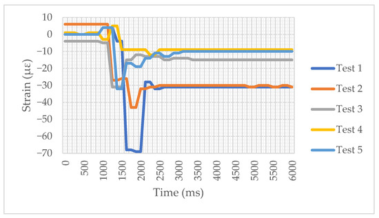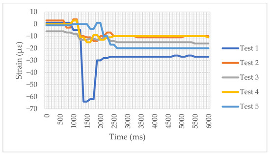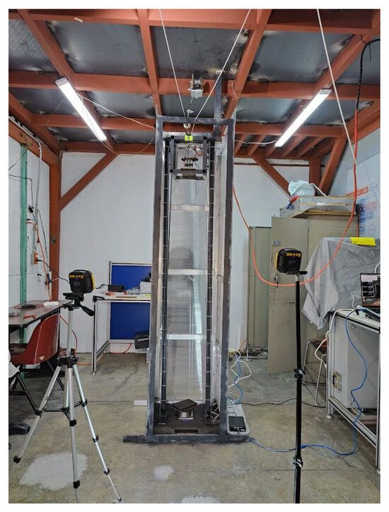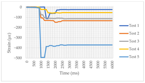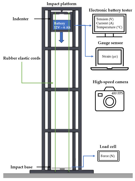 During the testing process, a slow-motion video was shot using a high-speed camera to perform a videogrammetric analysis of the linear kinematics of the mechanical shock process on the battery module. Additionally, the use of strain gauges enables the measurement of deformations within the internal cells. Additionally, the module’s temperature, voltage, and current are monitored by an electronic battery tester. Figure 5 shows an outline of the design of the experiment.