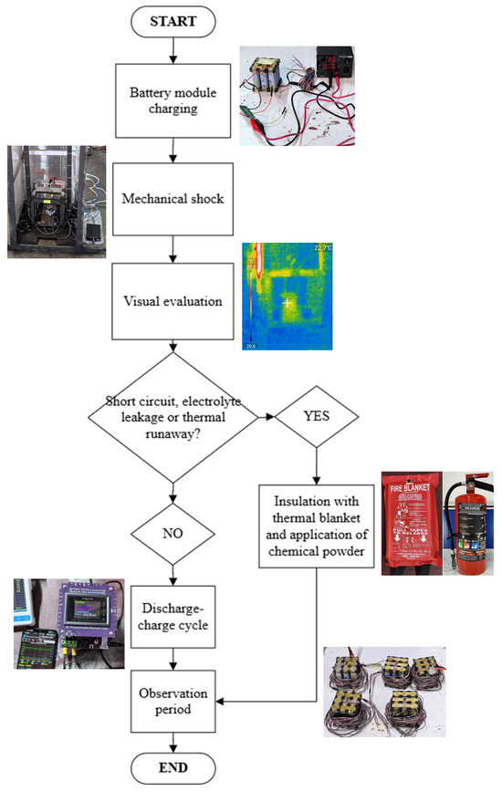 The safety of the energy storage systems of electric vehicles is critical for their safe use on the streets, as even the highest level of protection is insufficient to prevent fires at high speeds. Zhu et al. [30] noted that battery packs are susceptible to penetration due to sideswipe collisions and road debris impacts. In mechanical abuse, LIBs could have malfunctions, such as the breakage of the module’s external and internal support elements. This can lead to the disconnection between main elements, such as the BMS with the cells, as well as the rupture of the connector plates between the internal cells, which would cause a reduction in the voltage and energy capacity of the module. In more serious failures, an external or internal short circuit may occur in the cells due to the intrusion of conductive materials into the module. In this condition, LIBs exhibit a voltage drop and an increase in temperature, which varies depending on the type of short circuit. In external short circuits, the increase in temperature and voltage drop is progressive, which causes electrolyte leakage due to the increase in internal pressure in the cell. However, if it were to occur between the longitudinal faces of the cells, the steel would melt due to the extreme increase in temperature, which would cause a fracture in the casing, allowing the electrolyte to leak.