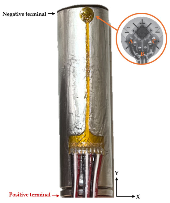 - Strain gauge installation: For this, the installation of triaxial gauges on the cell housing was proposed to measure the deformations in the longitudinal and circumferential axes of the cell. The material used for these tests is the triaxial gauges or MicroMeasurements® rosettes C4A-06-G1350A-120-39P, which are described in Table 7, in conjunction with the D4 data acquisition system. The strain gauge used is a stacked rosette type. Figure 9 shows the 0° (A-gauge), 45° (B-gauge), and 90° (C-gauge) configuration of the strain gauge. The gauge was installed using the manufacturer’s recommended bonding material and method, ensuring the correct orientation of the gauge with respect to its positive and negative terminals. 3s3p cell positioning: A 3s3p configuration is proposed for cell positioning. In this configuration, the cell with gauge rosette installed is in the central position and surrounded by eight cells, in the same pattern found in the LEV’s battery modules.