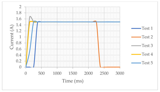 In this cell, the used charging method is the constant current–constant voltage (CC/CV) method. The manufacturer reports that experiments and measurements were carried out under a standard temperature (23 ± 2 °C) and standard humidity (65 ± 20%). In Figure 2, a detailed log of charging characteristics is shown, where 1000 mA (0.5C) of CC is applied until the limit voltage of 4.2 ± 0.05 V is reached. Then, a CV phase begins, and the current starts to decrease until it reaches 20 mA (0.01C), at which point it cuts off.