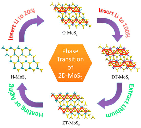 - Cheng, Y.; Nie, A.; Zhang, Q.; Gan, L.-Y.; Shahbazian-Yassar, R.; Schwingenschlogl, U. Origin of the phase transition in lithiated molybdenum disulfide. ACS Nano 2014, 8, 11447–11453. [Google Scholar] [CrossRef] [PubMed]