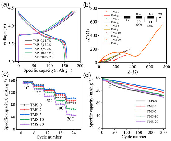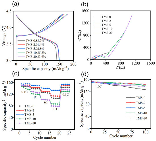 Subsequently, EIS tests (Figure 6b) were conducted on these stabilized batteries. The test conditions were set with an alternating voltage signal amplitude of 10 mV and a frequency range from 10 mHz to 100 kHz. As shown in the figure, TMS-5 exhibits the smallest charge transfer internal resistance, measuring only 48.4 Ω, while TMS-20 has the largest internal resistance, reaching 431.6 Ω. When the proportion of TMS additive is 5 wt%, the corresponding lithium-ion full battery demonstrates the lowest internal resistance. However, as the proportion of TMS additive increases to 10 wt% and 20 wt%, the impedance performance of the electrolyte and battery decreases instead. This is because an excessively high proportion of TMS increases the viscosity of the electrolyte, thereby hindering ion transport. To investigate the impact of different proportions of TMS additive on the rate performance of full cells, rate tests were conducted on five groups of full cell samples (Figure 6c). The test conditions were set at a potential range of 3.0 to 4.4 V, with charge–discharge cycles at 0.1 C, 1 C, 5 C, 10 C, and back to 0.1 C, each cycle being repeated five times. The results indicate that the rate performance of full cells with TMS contents of 2 wt% and 5 wt% is improved compared to full cell samples without TMS additive. Among them, the TMS-5 sample exhibits the most outstanding rate performance, with discharge specific capacities of 154.7, 151.2, 142.5, and 133.1 mAh g−1 at 0.1 C, 1 C, 5 C, and 10 C. The capacity retention rate at 10 C is 86.0%, demonstrating that a 5 wt% proportion of TMS additive effectively enhances the rate performance of the full cell by improving the stability of the electrolyte and thus the battery under high voltage and high current conditions. In contrast, the TMS-20 sample has discharge specific capacities of 150.0, 128.7, 101.9, and 80.1 mAh g−1 at 0.1 C, 1 C, 5 C, and 10 C, respectively, with a capacity retention rate of only 53.4% at 10 C, indicating poor rate performance. This suggests that a high dosage of TMS additive actually deteriorates the rate performance of the full cell, primarily due to the excessive TMS proportion increasing the overall viscosity of the electrolyte, which, in turn, hinders ion transport within the electrolyte.