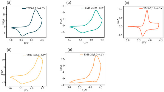 Furthermore, CV tests (Figure 3 and Figure S6) were conducted on lithium-ion batteries containing five different proportions of TMS additives within various voltage ranges. The voltage windows were set to 3.0–4.0 V, 3.0–4.1 V, 3.0–4.2 V, 3.0–4.3 V, 3.0–4.4 V and 3.0–4.5 V, respectively, with a consistent scan rate of 0.2 mV/s. As illustrated in Figure S6, the charge–discharge processes of all sample groups exhibit a predominantly stable behavior under relatively low test voltages. To elucidate the performance disparities among these samples within the low-voltage regime, the coulombic efficiencies of each battery were systematically calculated based on the CV curves acquired across various voltage intervals (detailed in Table S2). The derived coulombic efficiency data were subsequently subjected to further analytical processing, the results of which are presented in Figure S7. Notably, within the low-voltage range, the TMS-2 and TMS-5 samples demonstrate superior charge–discharge stability compared to the other sample groups.