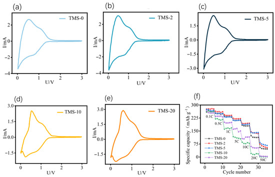 CV curves of SC//Li half-cells with different TMS contents: (a) TMS-0; (b) TMS-2; (c) TMS-5; (d) TMS-10; (e) TMS-20; (f) rate curve of SC//Li half-cells with different TMS contents. All potentials in this figure are referenced to the Li+/Li electrode.
