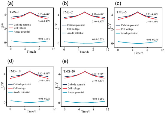 Cathode and anode electrode potential during charging and discharging: (a) TMS-0; (b) TMS-2; (c) TMS-5; (d) TMS-10; (e) TMS-20. All potentials in this figure are referenced to the Li+/Li electrode.