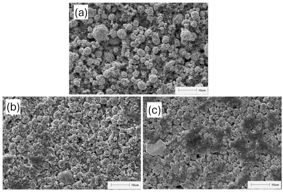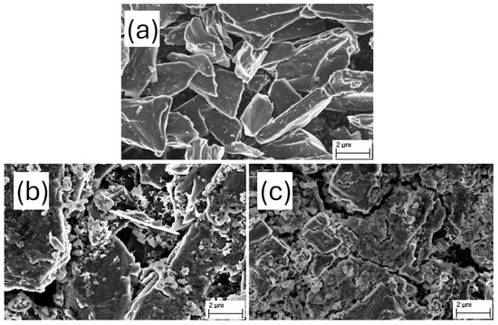 Scanning electron microscope image of cathode electrode: (a) before cycling, (b) TMS-0 cathode electrode after cycling, (c) TMS-5 cathode electrode after cycling.