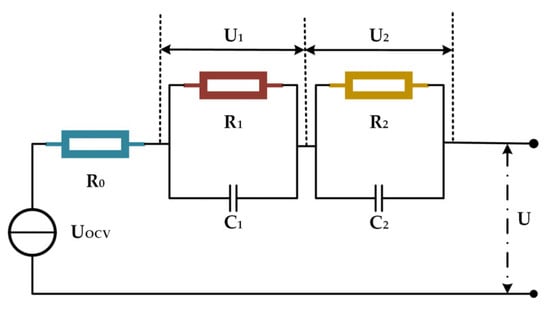 The model consists of an ideal voltage source , input current , ohmic internal resistance , polarization resistances and , equivalent polarization capacitors , , and battery terminal voltage . According to Kirchhoff’s voltage law, the model equation is expressed as Equation (1):