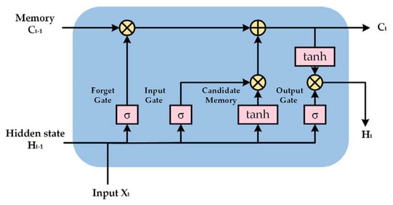 In the task of SOC prediction for SIBs, the LSTM model, as a purely data-driven approach, can directly learn the nonlinear dynamic characteristics embedded in the battery’s charging and discharging processes from multidimensional historical input data, such as current, voltage, and temperature, thus avoiding the complexity of physical modeling. Traditional recurrent neural networks often struggle to capture long-term dependencies due to issues such as vanishing or exploding gradients when processing long sequences. As illustrated in Figure 2, LSTM overcomes these limitations by introducing memory cells and gating mechanisms—including input, forget, and output gates—that selectively retain or discard information. This enables the network to effectively model key information over long time sequences, significantly enhancing its ability to extract temporal features.