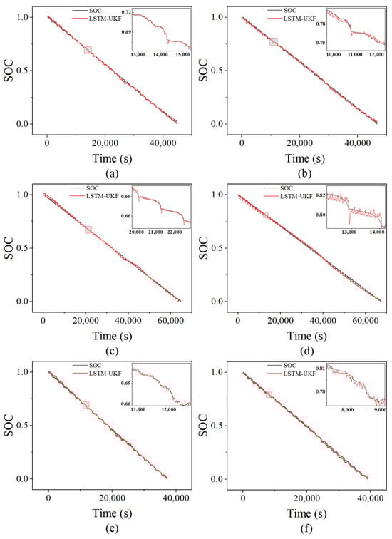 As shown in Figure 5, the LSTM-UKF fusion model demonstrates excellent SOC prediction performance under various operating conditions. Its core advantage lies in the ability to jointly model dynamic disturbances, nonlinear characteristics, and noisy environments. Notably, under scenarios with significant condition variations, the LSTM-UKF fusion model can quickly adapt its prediction strategy and maintain high prediction accuracy, whereas single models tend to exhibit prediction deviations and fail to capture the real-time variation of battery SOC accurately. These results validate the superior performance of the LSTM-UKF fusion model in handling complex operating conditions, offering a novel approach and methodology for the accurate SOC estimation of SIBs.