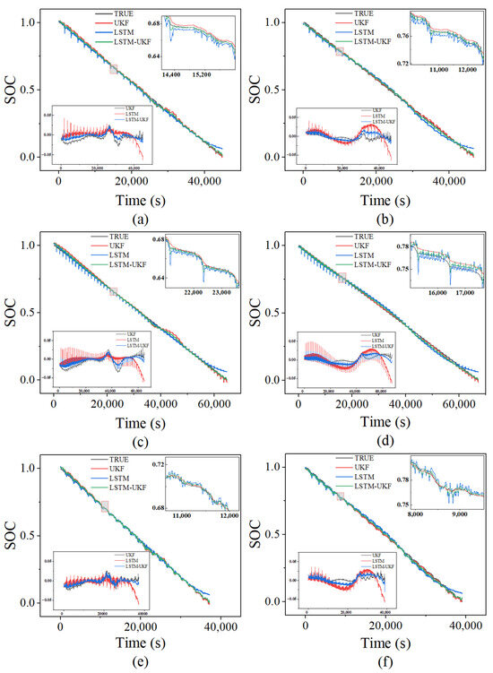 The proposed hybrid method integrates the temporal modeling capability of LSTM with the state correction ability of UKF. Fusion is guided by a confidence weighting mechanism dynamically adjusted using FFRLS, which allocates greater influence to the model with better short-term accuracy. This synergy results in improved estimation stability, especially under variable load conditions. To evaluate the effectiveness of these models, detailed experiments were conducted, and the results are illustrated in Figure 6.