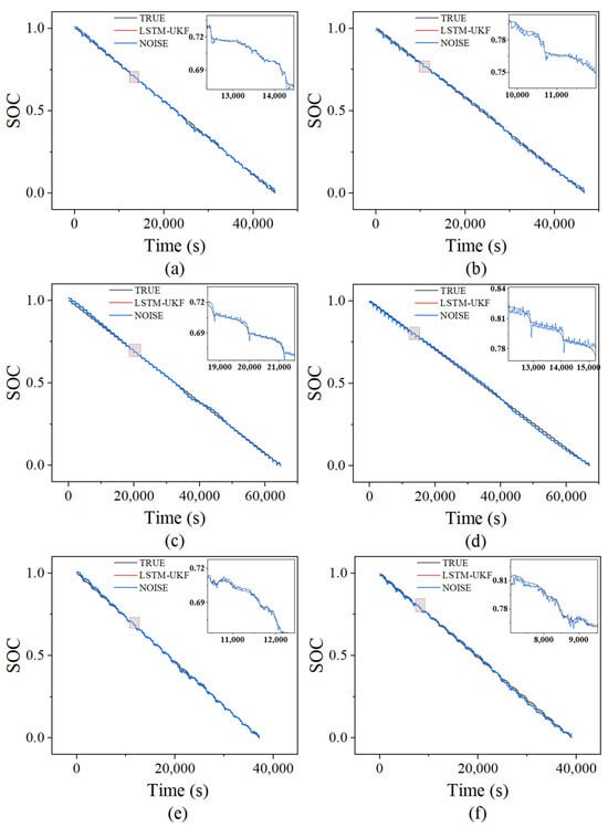 To evaluate the robustness and stability of the proposed LSTM-UKF fusion algorithm under complex environments, Gaussian white noise was artificially introduced in the experiments to simulate common non-ideal factors, such as sensor inaccuracies, environmental disturbances, and model uncertainties. Specifically, voltage noise with a standard deviation of σ = 10 mV and current noise with σ = 50 mA were added to the measurement signals. Multiple interference levels with signal-to-noise ratios (SNRs) of 20 dB, 30 dB, and 40 dB were set to cover the disturbance range commonly encountered in industrial scenarios.