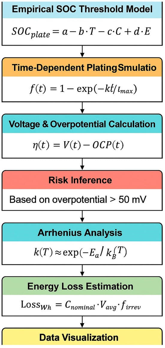 Flowchart outlining the computational framework used in this study for Li plating analysis. The workflow integrates an empirical SOC plating threshold model with time-resolved plating fraction modeling, energy loss estimation, Arrhenius-based activation analysis, and risk visualization to assess and mitigate lithium plating under fast-charging conditions.