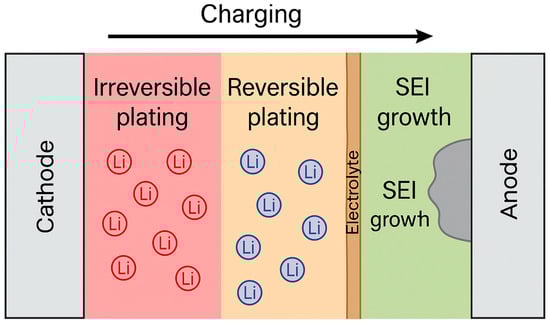 Figure 2 presents a conceptual model capturing the electrochemical evolution of Li plating during high-rate charging. As Li ions approach the anode, they initially contribute to the formation and growth of the solid electrolyte interphase (SEI), a critical passivation layer that stabilizes the electrode–electrolyte interface. Under aggressive charging protocols, the Li flux may exceed the insertion capacity of the anode, leading to the nucleation of metallic Li on the surface. This deposition behavior can be partitioned into two regimes: reversible plating, wherein deposited Li remains electrochemically active and is reoxidized during discharge, and irreversible plating, wherein Li becomes electronically isolated, forming inactive or “dead” Li. The latter significantly impairs capacity retention and enhances cell impedance. The schematic emphasizes that the onset of irreversible plating is a key degradation mechanism under fast-charging conditions. Therefore, controlling the overpotential, electrolyte composition, and temperature are essential strategies to enhance charge acceptance while minimizing irreversible Li loss and ensuring long-term cycling stability. Several factors can exacerbate lithium plating during fast charging. Low temperatures significantly reduce lithium-ion diffusion and intercalation rates within the graphite anode, making it more likely for lithium to deposit as metallic Li on the surface. Additionally, insufficient active material in the negative electrode—whether due to electrode design constraints or prior capacity loss—limits the availability of intercalation sites. These conditions hinder the competing intercalation process, increase the local overpotential, and elevate the risk of plating. Incorporating these parameters into predictive models is essential for accurately identifying high-risk operating regimes and designing robust charging protocols.