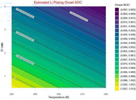 To visualize the onset of lithium plating under varying fast-charging conditions, we applied the empirical model SOCplate = a − b · T − c · C + d · E, as detailed in the Computational Methodology section. A data matrix was generated over a temperature range of 280–320 K and C-rates from 1 to 5 C, with the specific energy fixed at 250 Wh/kg. Figure 3 displays the resulting contour map, showing how the plating onset SOC shifts to lower values as the charge rate increases and temperature decreases. These trends are consistent with known kinetic limitations and overpotential-driven effects that elevate plating risk. The contour map serves as a practical diagnostic tool to quickly evaluate and avoid critical operating conditions during fast charging. At lower temperatures (e.g., 280–290 K) and high C-rates (>3 C), the plating onset occurs as early as SOC ≈ 0.92, indicating a narrower safe operating window during fast charging. Conversely, at elevated temperatures and modest charge rates (<1.5 C), the system tolerates SOC values up to 1.0 before plating onset is predicted. This contour map offers valuable insights into safe design limits, guiding BMSs to avoid critical regimes prone to Li deposition. The observed gradient further supports previous reports that low-temperature/high-rate charging disproportionately accelerates plating due to slower Li-ion diffusion and increased overpotential [,]. These results underpin the necessity of thermal regulation and adaptive current control in fast-charging scenarios to prevent irreversible Li accumulation and ensure long-term cell stability.