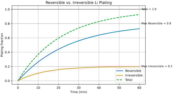 Figure 6 illustrates the comparative dynamics of reversible and irreversible Li plating during a fast-charging protocol. The reversible fraction increases sharply during the initial stages of charging, stabilizing at approximately 80% of the total deposited Li. In contrast, the irreversible fraction accumulates more gradually and saturates near 20%, consistent with prior experimental observations of lithium becoming electronically or physically isolated due to SEI entrapment or void formation [,]. The clear separation in growth kinetics between the two fractions underscores the time-sensitive nature of plating reversibility. Fast early stage diffusion and exchange kinetics favor reversible deposition; however, once critical nucleation thresholds are crossed—often exacerbated by elevated current densities or reduced temperature—irreversible loss becomes predominant. This distinction is particularly relevant for battery life and efficiency, as irreversible plating contributes to both active Li loss and impedance growth.