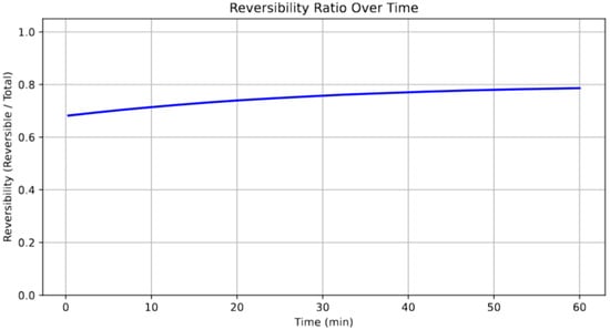 Figure 7 presents the evolution of the reversibility ratio of lithium plating during fast charging, highlighting the proportion of lithium that remains electrochemically accessible. The data reveal a monotonic increase in reversibility over time, asymptotically approaching a maximum of approximately 79% by the end of the simulated charge period. This trend reflects the initial dominance of kinetic limitations that promote irreversible plating, such as dendrite entrapment or SEI-enclosed lithium. As the system approaches equilibrium, favorable thermodynamic conditions and surface saturation limit additional irreversible accumulation, allowing the relative proportion of reversible lithium to increase. Such behavior underscores the critical importance of charging protocols that minimize the early onset of plating to preserve long-term capacity and coulombic efficiency. Moreover, maximizing the reversibility ratio is essential for extending cycle life and reducing inactive Li accumulation []. It should be noted that the simulated reversibility ratio (~0.79) corresponds to an idealized scenario without prior cycling or SEI degradation. In real-world applications, factors such as electrolyte decomposition, SEI layer growth, and repeated cycling can lead to higher irreversibility and lower lithium recovery. As such, the reported value reflects a best-case, early-cycle condition. Future work will extend the model to account for cycle-dependent degradation and history effects to better match long-term battery performance in practical applications.
