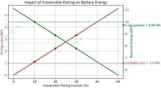 Relationship between irreversible Li plating fraction and associated energy loss (red, left axis) and retained usable energy (green, right axis). Thresholds for acceptable energy loss (1.0 Wh) and minimum retained energy (9.99 Wh) are indicated with dashed lines.
