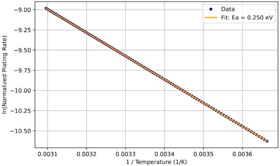 Arrhenius plot of the natural logarithm of the normalized Li plating rate as a function of inverse temperature. The linear fit yields an activation energy of Ea = 0.25 eV, highlighting thermally activated behavior.