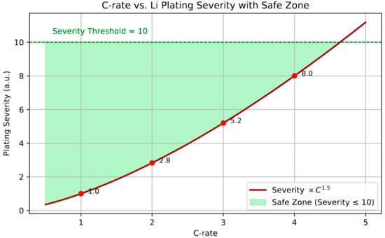 Relationship between charging C-rate and estimated lithium plating severity. The severity exhibits a non-linear dependence, increasing with C1.5, with a safe operating threshold defined at a severity index of 10.