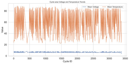 Each feature in Table 2 was aggregated cycle-wise to provide interpretable inputs to the DL model. The use of mean voltage as a proxy for SOH estimation has been shown to correlate well with real degradation trends, especially when normalised against the initial cycle baseline [30]. Thermal and current features were included to capture the effects of electrothermal coupling and dynamic loads, which are known to accelerate degradation in lithium-ion batteries. This structured feature set enabled both the recurrent and attention-based modules in the V2G-HealthNet architecture to identify latent degradation dynamics and predict end-of-life with greater fidelity.