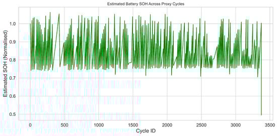 Figure 10 illustrates the scheduling of load intensities across 3400 proxy cycles, colour-coded by the corresponding battery SOH values. High-load assignments (>2 A) were consistently associated with batteries exhibiting an SOH > 0.85, whereas low-load tasks were predominantly scheduled for batteries with a lower SOH. This demonstrates that the V2G-HealthNet framework can enable dynamic load balancing that accounts for individual cell ageing, thereby prolonging system-wide utility and reducing failure risk.