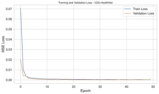 Algorithm 1 presents the training and validation procedure used for the V2G-HealthNet framework. This process begins by randomly initialising the model’s learnable parameters, including the weights of the LSTM, Transformer, and final MLP layers. The optimiser used is the Adam optimiser, which is configured with a learning rate selected through empirical tuning. To prevent overfitting, an early stopping mechanism is implemented. This involves tracking the best validation loss seen so far and terminating training if no improvement is observed over a defined number of consecutive epochs, denoted as the patience parameter p.