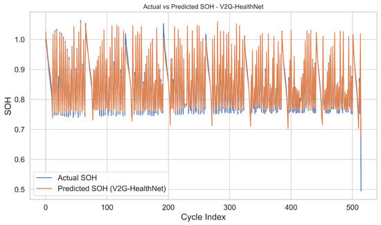 As summarised in Table 4, V2G-HealthNet achieved an RMSE of 0.015, an MAE of 0.012, and a coefficient of determination () of 0.97. These metrics outperform all baselines, with the next best method, XGBoost, yielding an RMSE of 0.022 and of 0.94. SVR lagged significantly behind, with an RMSE of 0.035 and of only 0.85.
