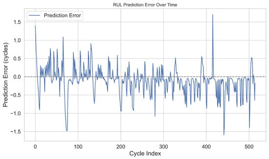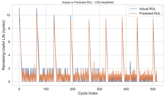 The RUL prediction model, trained on a dynamically labelled dataset based on a degradation threshold of SOH < 0.80, achieved an average MAE of 0.42 cycles across a five-cycle prediction horizon. Over 85% of the predictions fell within ±1.0 cycle of the ground truth, as shown in Figure 7 and Figure 8. While DL models can be prone to instability at end-of-life transitions, V2G-HealthNet retained consistency even in high-gradient regions of degradation, where the SOH can drop rapidly by 0.05–0.10 units across consecutive cycles.