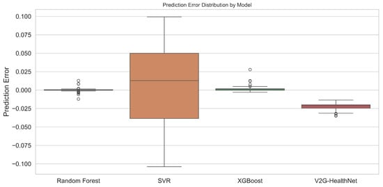 Quantitatively, V2G-HealthNet achieved an RMSE of 0.015, an MAE of 0.012, and a coefficient of determination for SOH estimation. These results significantly outperform RF (RMSE = 0.025, ), XGBoost (RMSE = 0.022, ), and SVR (RMSE = 0.035, ). The boxplot in Figure 9 further illustrates the superiority of the proposed model, showing a narrow interquartile range (IQR < 0.01) and minimal outliers. The SVR model, by contrast, exhibited high variance, with prediction errors spanning over ±0.1 SOH units in certain cases.