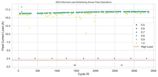 SOH-aware fleet load scheduling. Each point corresponds to a proxy cycle, coloured by normalised SOH. The red dashed line indicates the high-load operational threshold (2.0 A).