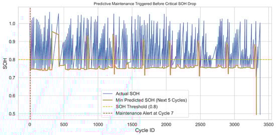 In addition, Figure 11 shows the early prediction of a critical health decline using a look-ahead forecasting window. The orange line represents the minimum predicted SOH over the next five cycles. A maintenance alert (vertical red line) was triggered at cycle 7, approximately three cycles before the SOH breached the failure threshold of 0.80 (dashed orange line). This predictive alerting mechanism offers sufficient lead time to schedule maintenance or reroute the vehicle, enhancing overall operational resilience.