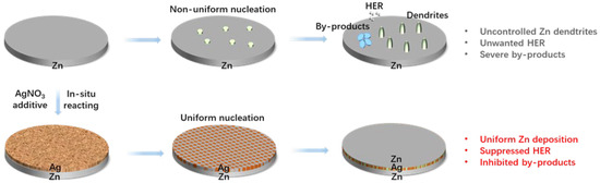 Scheme of Zn anode evolution in the electrolyte without and with the AgNO3 additive.