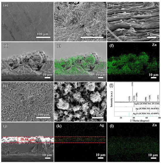 Figure 1 schematically illustrates the protective mechanism of the Zn anode after introducing AgNO3 additive into the electrolyte. During cycling, an in situ formed hierarchical porous Ag interfacial phase with high zinc affinity is constructed on the zinc surface. This interfacial phase provides abundant zinc nucleation sites and sufficient accommodation space, promoting uniform Zn deposition/stripping. Moreover, the chemically inert Ag phase effectively suppresses side reactions by isolating water molecules, inhibits dendrite growth and by-product formation, and thus enhances the stability of the zinc anode. AgNO3 dissolved in 3 mol/L ZnSO4 electrolyte (ZS) forms the AgNO3/ZnSO4 electrolyte (AN/ZS), depicted in Figure S1. Modified electrolytes containing 1, 3, 5, 8, 10 mmol/L of AgNO3 are denoted 0.001 M to 0.01 M AN/ZS. The effect of AgNO3 additive on the zinc deposition behaviors was first studied by examining plated/stripped zinc anodes in the 0.005 M AN/ZS electrolyte. SEM images reveal a flat zinc electrode surface before charging/discharging (Figure 2a). After 20 stripping cycles in ZS electrolyte at 1 mA/cm2 for 1 mAh/cm2, large platelets form a rough surface by stacking perpendicularly on the electrode (Figure 2b,c) [35]. These platelets, identified as zinc dendrites, are over 20 μm thick (Figure 2d), confirmed by pure zinc distribution in energy dispersive spectrometer (EDS) mapping (Figure 2e,f). In contrast, the zinc electrode after 20 stripping cycles in AN/ZS electrolyte lacks perpendicular dendrites, instead showing a uniform layer of particulate matter (Figure 2g). Magnified SEM images indicate these particles have a porous nanosheets structure (Figure 2h). EDS mapping (Figure S2) shows even distribution of Zn and Ag in the particles. XRD analysis post-20th stripping in AN/ZS electrolyte confirms the presence of Ag (JCPDS NO. 04-0783) and a small amount of AgZn (JCPDS NO. 29-1155) and Ag2O (JCPDS NO. 43-0997) in the coating (Figure 2i). The rapid blackening of the zinc electrode surface upon immersion in AN/ZS is attributed to Ag replacement, with Ag2O possibly resulting from Ag oxidation by dissolved oxygen [36]. The AgZn alloy minor phase could be the solid solution product of the replacement reaction [37]. The cross-sectional SEM images show that the Ag layer is relatively uniform and about 10 µm thick (Figure 2j). EDS characterization reveals an even distribution of Ag and Zn elements in the interphase (Figure 2k,l). According to the literature, Ag has good zincophilicity, and zinc can preferentially nucleate on Ag [38]. The competition effect of Ag suppresses the zinc nucleation on the zinc metal surface [39,40]. And the porous structure of Ag metal particles can provide three-dimensional space to host zinc, therefore alleviating zinc dendrite growth [10,11,12].