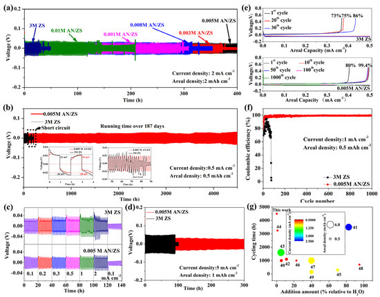 The concentration of the additive was optimized. The symmetric cell cycled at 2 mA/cm2 with a capacity of 2 mAh/cm2 lasted only about 26 h in the pristine ZS electrolyte (Figure 3a), whereas the cell with 0.005 M AN/ZS electrolyte maintained stable cycling for 400 h, which is the longest among all tested additive concentrations and more than 10 times longer than that with the ZS electrolyte. This optimal concentration ensures balanced interfacial behavior during the electrochemical reduction process. At low concentrations below 0.005 M, the amount of Ag+ is insufficient to form a continuous and compact Ag interfacial phase, resulting in poor nucleation sites and limited suppression of dendrite growth. At high concentrations above 0.005 M, excessive Ag+ causes an intense displacement reaction with the Zn substrate, leading to uneven Ag deposition, increased interfacial resistance, hindered Zn2+ transport, and non-uniform Zn plating. When cycling at 0.5 mA/cm2 for 0.5 mAh/cm2 in the 0.005 M AN/ZS electrolyte, the polarization voltage is approximately 39 mV, which is significantly lower than that in the ZS electrolyte (~48 mV). This reduction indicates that the AgNO3 additive effectively lowers the energy barrier for Zn nucleation, promotes more uniform zinc deposition, and suppresses dendrite formation. Furthermore, a sudden drop in polarization voltage was observed after about 76 h of cycling in the ZS electrolyte, likely due to dendrite-induced short-circuiting caused by uncontrolled Zn dendrite growth. In contrast, the symmetric cell with 0.005 M AN/ZS electrolyte exhibited outstanding cycling stability, operating steadily for over 4500 h (187 days, Figure 3b). These results clearly demonstrate that the AgNO3 additive effectively inhibits dendrite growth and enhances long-term electrochemical performance. At 5 mA/cm2 for 1 mAh/cm2, the cell cycles for 300 h in the 0.005 M AN/ZS electrolyte, substantially more than the 90 h achieved with the ZS electrolyte (Figure 3c). Additional tests confirm the enhanced stability provided by the 0.005 M AN/ZS electrolyte at other current densities and capacities (Figure S3). Furthermore, the presence of AgNO3 additive in the electrolyte reduces the overpotential during charge and discharge cycles across various current densities (Figure 3c,d). Tests on Zn//Cu asymmetric cells at 1 mA/cm2 for 0.5 mAh/cm2 confirm that lower overpotential and a higher Coulombic efficiency (CE) from 86% to 99.4% for zinc deposition and dissolution are obtained in the 0.005 M AN/ZS electrolyte compared to the ZS electrolyte (Figure S4 and Figure 3e,f). This suggests that zinc dendrite growth and side reactions are minimized and zinc dendrite growth can be attributed to numerous nucleation sites of the hierarchical Ag interphase [41,42,43]. The maximum cycle life achieved with this method is 4500 h, outperforming recent reports involving other additives or modified zinc anodes (Figure 3g and Table S1) [23,44,45,46,47,48,49,50,51,52].