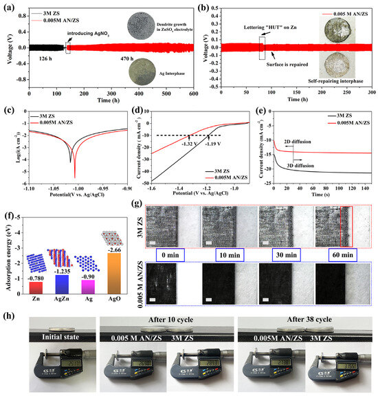 (a) Voltage profiles of Zn||Zn symmetrical cells cycling in ZnSO4 electrolyte for 126 h and then introducing AN under 1 mAcm−2, 0.25 mAhcm−2. (b) Cycling performance of Zn||Zn symmetrical cells in 0.005 M AN/ZS electrolyte before and after lettering recombination under 1 mAcm−2, 0.25 mAhcm−2. (c) Linear polarization curves of Zn anodes tested at 10 mV/s, (d) LSV curves for the Zn anode test at 5 mV/s, (e) chronoamperometry curves of Zn anode at a −150 mV overpotential in the ZS and 0.005 M AN/ZS electrolyte. (f) The adsorption energies of Zn atom on Zn (101), Ag (111), and Ag2O (111) surfaces. Inset: corresponding computational models. (g) In situ optical microscope images of the Zn deposition process in ZS and 0.005 M AN/ZS electrolytes at 5 mA/cm2. (h) The photos of symmetrical cells with the ZS and 0.005 M AN/ZS electrolytes after 0 cycles, 10 cycles, and 38 cycles at 0.5 mA/cm2 for 0.5 mAh/cm2, respectively.