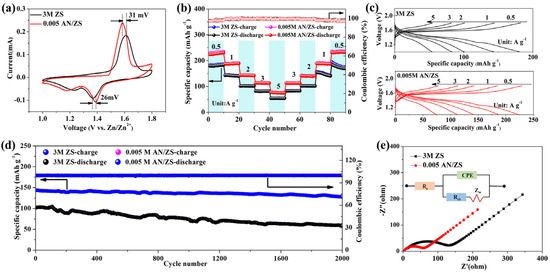 Electrochemical behavior of Zn//MnO2 full cell with the ZS and 0.005 M AN/ZS electrolytes. (a) CV curves at 0.1 mV/s, (b) rate performance, and (c) charge−discharge curves at different current densities. (d) Long-term cycling stability and efficiency at 2 A/g. (e) Electrochemical impedance spectroscopy after 2000 cycles.