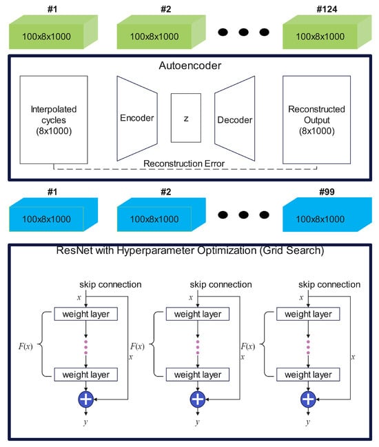 The overall framework of this study, illustrated in Figure 1, comprises multiple systematic procedures designed to ensure robust and accurate prediction of RUL. Initially, interpolation techniques are applied to standardize all battery cycle data, resulting in a consistent representation of 1000 data points per cycle. Subsequent feature selection is carefully guided by criteria that ensure independence across battery cycles, explicitly excluding statistical features that vary across cycles. Instead, the study utilizes raw measurements directly obtainable from practical battery management systems (BMS), including voltage, current, temperature, and integrated capacity during both charging and discharging phases for training autoencoders. K-fold cross-validation is implemented to thoroughly assess the generalization and predictive performance of the proposed models. This validation procedure partitions the dataset into three subsets, iteratively utilizing each subset for validation while training with the remaining subsets. Furthermore, autoencoders detect and remove anomalous data samples based on reconstruction error criteria. Consequently, 25 out of the initial 124 cells are excluded, leaving a dataset comprising 99 cells for subsequent analysis. Even after this filtering step, the remaining dataset size surpasses that utilized in previously published benchmark studies, notably the single-cycle RUL prediction approach by Hsu et al. [24]. Finally, hyperparameter optimization of the ResNet architecture is conducted through a systematic grid search approach.