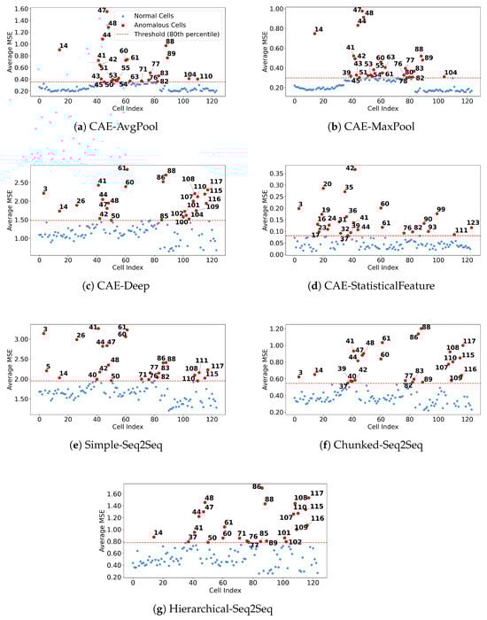 Comparison of anomaly detection outcomes based on reconstruction errors from various autoencoder architectures. Each subplot corresponds to a different autoencoder method: (a) CAE-AvgPool, (b) CAE-MaxPool, (c) CAE-Deep, (d) CAE-StatisticalFeature, (e) Simple-Seq2Seq, (f) Chunked-Seq2Seq, and (g) Hierarchical-Seq2Seq. Blue points represent battery cells identified as normal, while red points indicate anomalous cells whose average mean squared error (MSE) exceeds the anomaly threshold, defined by the 80th percentile of reconstruction errors (shown as a red dashed line). Numbers next to red points specify the cell indices identified as anomalous. The figure illustrates distinct patterns in anomaly detection effectiveness across different autoencoder architectures, reflecting their varying strategies for dimensionality reduction and their capabilities in accurately reconstructing the battery cycle data.