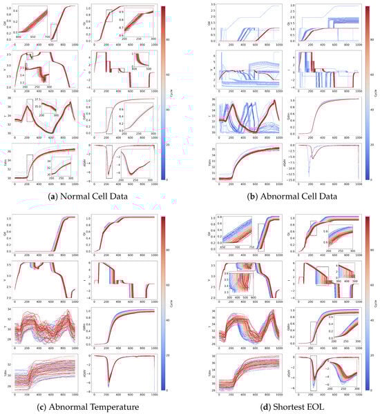 Comparison of normal and abnormal battery cell data illustrating characteristic measurement patterns across cycles: (a) Normal cell data showing consistent, stable trends in charge capacity (QC), discharge capacity (QD), linearly interpolated discharge capacity (QDlin), voltage (V), current (I), temperature (T), and linearly interpolated temperature (Tdlin). (b) Abnormal cell data demonstrating irregularities, voltage spikes, and inconsistent patterns indicative of potential sensor or operational issues. (c) Abnormal temperature behavior specifically highlighting unusual temperature fluctuations that impact battery performance, consistent with previously reported anomalies [22,24]. (d) Battery cells with notably short end-of-life (EOL), exhibiting accelerated degradation or irregular trajectories compared to typical cells; these particular samples were typically excluded in previous studies [29,30]. In all subfigures, the color gradient (blue to red) corresponds to cycle indices, where blue represents earlier cycles and red indicates later cycles, clearly illustrating the evolution of battery measurements over time.