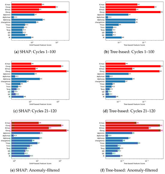 Figure 4 presents a comparative analysis of feature importance derived from RF models across different datasets, utilizing SHapley Additive exPlanations (SHAP) and tree-based methodologies. All analyzed features originate from Lee et al. [34], with newly introduced features specifically highlighted in red to emphasize their novel contribution. Key features include internal resistance (IR), which indicates electrical resistance within the battery cell, as well as charge and discharge capacities (QC and QD), reflecting the battery’s capacity to store and deliver electrical charge, respectively. Temperature-related metrics such as average (), minimum (), and maximum () temperatures capture thermal behaviors throughout battery cycles. Additionally, incremental capacity features include average (), maximum (), and minimum () values. Current-related parameters, covering average and maximum values during both charge (, ) and discharge cycles (, ), further contribute insights into battery performance and stress conditions. Features newly introduced and emphasized by Lee et al. are distinctly highlighted in red within the figure. Figure 4a,b illustrate the feature importance scores for the dataset covering cycles 1–100. Both SHAP and tree-based analyses consistently identify newly introduced features from [34] (e.g., , and ) as highly significant predictors, validating their importance in battery degradation modeling. The alignment between SHAP and tree-based results strengthens the validity of the identified feature importance, as the convergence of two complementary methods reduces the likelihood of analytical bias. In Figure 4c,d, covering cycles 21–120, the same newly introduced features remain prominently influential, confirming their robustness across different cycle ranges. However, minor differences in feature rankings between methods and cycle ranges underline the sensitivity of these metrics to specific dataset configurations and reinforce the importance of employing multiple analytical methods. Figure 4e,f present feature importance scores after anomaly removal. Most significantly, the importance of the maximum temperature feature () substantially increases after filtering anomalies, suggesting that removing anomalous cells reveals the critical predictive role of temperature-related features.