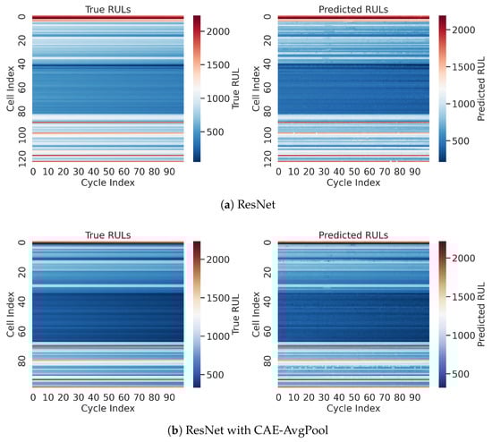 Figure 5 provides an image visualization comparing cycle-by-cycle true and predicted remaining useful life (RUL) across multiple battery cells and cycles. This visualization is intended to provide an intuitive, qualitative overview of model accuracy differences between methods, complementing detailed numerical comparisons. Color intensity corresponds directly to RUL values: darker blue indicates lower RUL (approaching end-of-life), while lighter colors or red indicate higher RUL values (earlier in battery life). The subfigures contrast (a) the baseline ResNet model, which shows noticeable deviations and inconsistencies relative to the true RUL values, with (b) the ResNet integrated with Simple-Seq2Seq, clearly demonstrating improved accuracy and better alignment between predicted and true RUL values across battery cycles and cells.