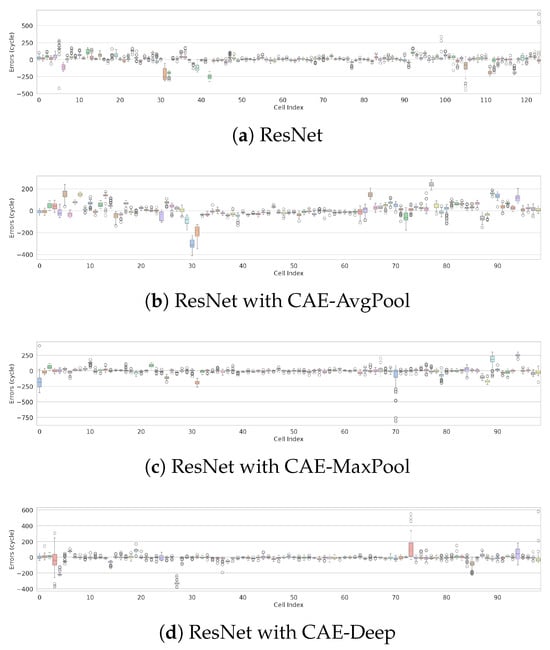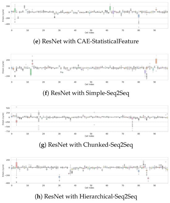 Figure 6 provides a precise, quantitative evaluation of the models, presenting the distribution of cycle-by-cycle prediction errors between true and predicted RULs across individual cells for different model architectures. The ResNet with Simple-Seq2Seq architecture achieves the highest prediction accuracy and robustness, demonstrated by tighter error distributions and minimal maximum absolute errors within cycles across nearly all cells. Additionally, the ResNet with CAE-StatisticalFeature architecture shows strong stability, maintaining relatively small error distributions for most evaluated cells. Architectures such as ResNet with CAE-AvgPool, CAE-Deep, Chunked-Seq2Seq, and Hierarchical-Seq2Seq outperform the baseline ResNet, resulting in overall reduced prediction errors. However, these models occasionally produce noticeable outliers with higher maximum absolute errors for specific cells. These findings suggest that integrating a Simple-Seq2Seq architecture with ResNet significantly enhances predictive accuracy and reliability for RUL estimation.