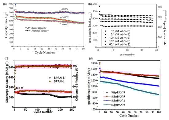 Yu et al.’s systematic investigation demonstrated that SPAN synthesized at 450 °C exhibited exceptional cyclability (90.4% capacity retention after 380 cycles) []. Wang et al. synthesized SPAN at 300, 350, and 400 °C and compared the electrochemical performances [] (Figure 5a). They identified the optimal temperature for the SPAN synthesis as 350 °C, with which the Li||SPAN battery delivered a reversible capacity of about 795 mAh g−1SPAN and a capacity retention of 98.1% after 50 cycles based on the 2nd discharge capacity. These findings were corroborated by Langrud et al., who showed complete sulfurization at 350 °C/3 h enabled 97% capacity retention over 100 cycles []. Fanous et al. also studied the influence of the synthesis temperature on the chemical structure and electrochemical performance of SPAN []. Higher synthesis temperature leads to lower sulfur content and higher degree of graphitization of the polymer backbone in SPAN, eventually resulting in higher rate capability and cycle stability. They concluded that SPAN prepared at temperatures > 450 °C showed a structural degradation, rendering 390–460 °C the optimal temperature range for synthesis. There observations were confirmed by Pan et al., who identified 300–400 °C for 12 h reaction time as producing SPAN with optimal electrochemical performance [].