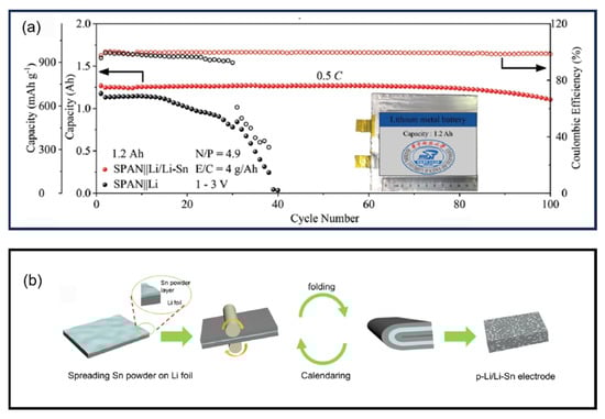 To overcome the challenges of conventional MSBs, sulfurized polyacrylonitrile (SPAN) has emerged as a promising cathode material, gaining significant research attention since its initial reports by Wang et al. during 2002 and 2004 [,,]. Unlike traditional C/S composites, SPAN features sulfur covalently bonded to a conductive polymer backbone in short-chain configurations (–Sn–, where 2 ≤ n ≤ 4), ensuring atomic-level dispersion []. The polypyrrole conductive framework in SPAN exhibits significantly higher electrical conductivity (10−5 to 10−7 S cm−1) compared to insulating elemental sulfur (10−30 S cm−1). A key advantage of SPAN is its “solid–solid” conversion mechanism during cycling, eliminating the issues associated with the solid–liquid–solid transition seen in C/S composites. This unique behavior grants SPAN several advantages: (1) compatibility with carbonate-based electrolytes, unlike C/S composites []; (2) minimal “shuttle effect”, enabling high sulfur utilization and superior cycling stability; and (3) improved performance under lean electrolyte conditions due to the absence of liquid-phase conversion process. However, SPAN still faces limitations that hinder its practical application: (1) low sulfur (typically 35–50 wt%, with up to ~56 wt%); (2) substantial volume expansion during cycling; (3) sluggish reaction kinetics; and (4) irreversible capacity loss in the first cycle. Despite these challenges, Metal||SPAN batteries hold great potential to outperform conventional LIBs, offering a theoretical energy density exceeding 1000 Wh kg−1 (based on cathode + metaillic lithium anode mass) compared to ~800 Wh kg−1 for Li||NMC batteries, while leveraging low-cost raw materials []. Continued advancements in Metal||SPAN batteries could position them as a viable high-energy, cost-effective alternative to conventional LIBs.