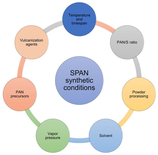 The chemical structure and the properties of SPAN are dependent on synthetic conditions. Various synthetic parameters including temperature, timespan, PAN/S ratio, powder processing, solvent, vapor pressure, PAN precursors, and vulcanization agents have been investigated by researchers to understand the correlation between the chemical structure and the property of SPAN and to optimize the synthetic procedure (Scheme 1). A comprehensive discussion is provided below.